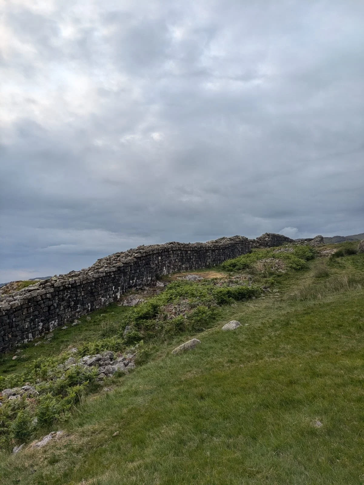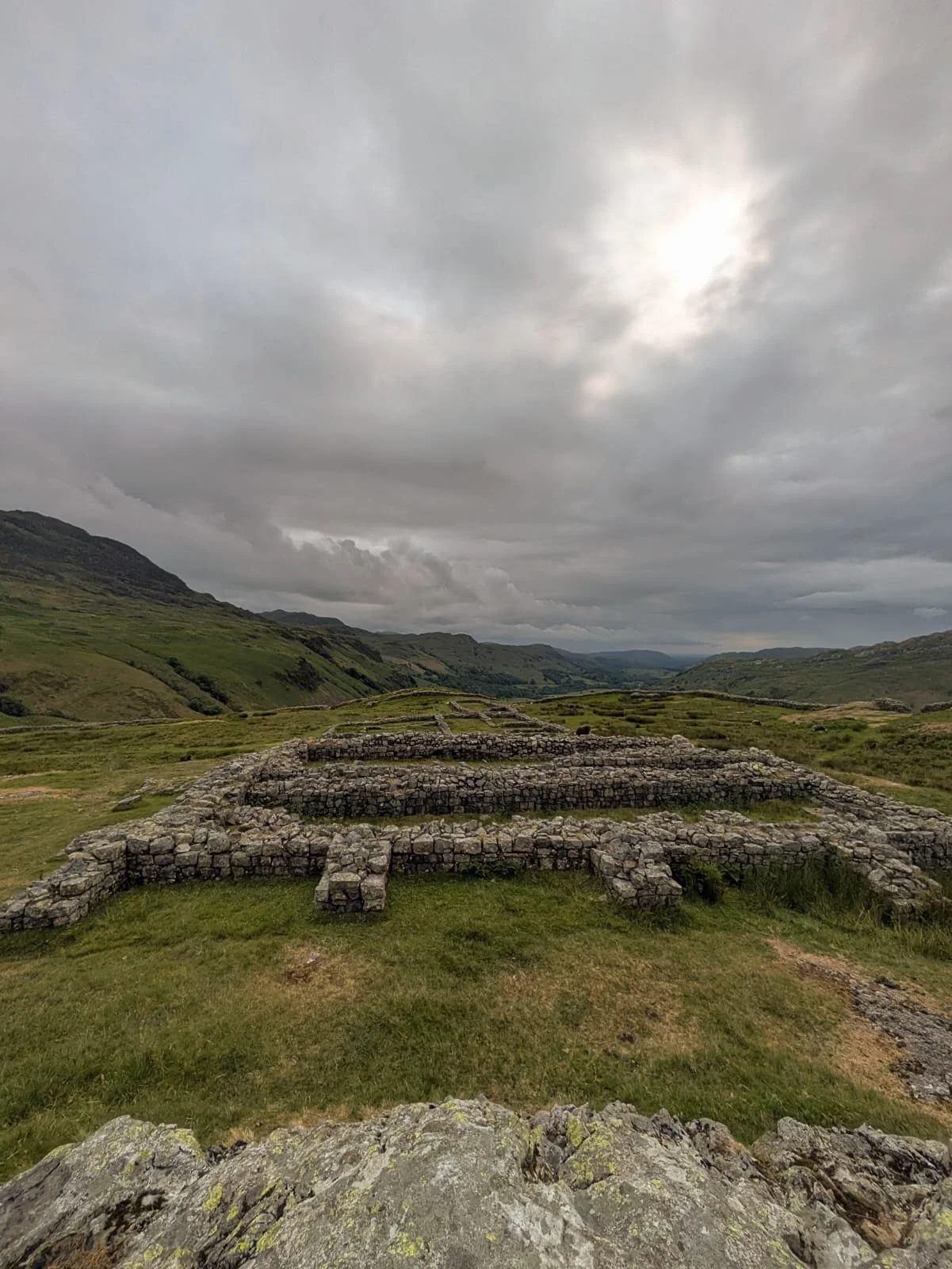Near the top, if you veer off slightly from the road, you’ll find the crumbled remains of Mediobogdum, the Hardknott Roman Fort and Thermae. It stands oddly intact against the harshness of its surroundings. A square of stone, wrapped in wind and cloud, staring down the valley like a memory refusing to be forgotten.